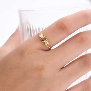 THREE STONE RED GARNET GEMSTONE RING, 925 SILVER RING PLATED WITH 2 MICRON 18KT GOLD