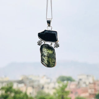Genuine Moldavite & Black Tourmaline Rough Pendant, 925 Sterling Silver Handmade Pendant, Moldavite Gemstone Pendant, Gift For Women's