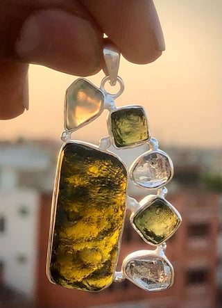 Genuine Moldavite Rough Herkimer Diamond Pendant Natural Gemstone From Czech Republic 925 Sterling Silver Handmade Designer Jewelry