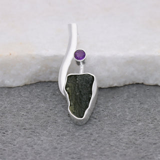 Genuine Moldavite Rough With Amethyst Pendant 100% Natural With Certified Gemstone From Czech Republic 925 Sterling Silver Handmade Jewelry