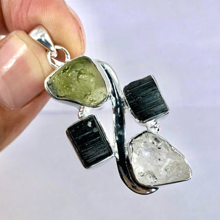 Moldavite Pendant, Black Tourmaline, Moldavite, Herkimer Diamond Pendant, Sterling Silver Pendant, Handmade Pendant, Natural Moldavite