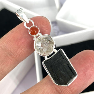 Black Tourmaline, Herkimer Diamond & Carnelian Natural Gemstone 925 Solid Sterling Silver Handmade Jewelry Pendant