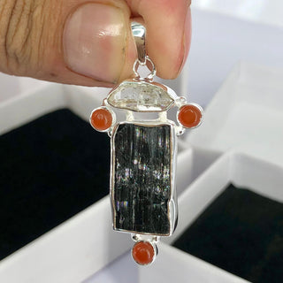 Black Tourmaline, Herkimer Diamond & Carnelian Natural Gemstone 925 Solid Sterling Silver Handmade Jewelry Pendant